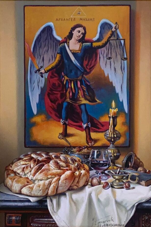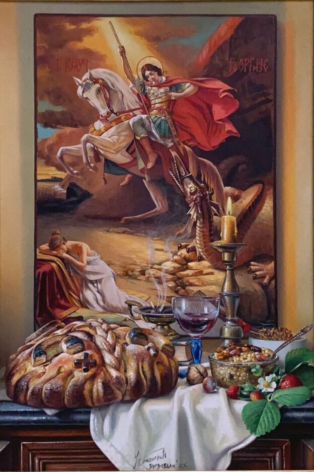 Umetnička slika Aranđelovdan slikar Jovica Tomašević – tehnika ulje na platnu kaširano na šperu – format slike sa ramom 75×55 cm – bez rama 60×40 cm – Cena umetničke slike 88500 dinara