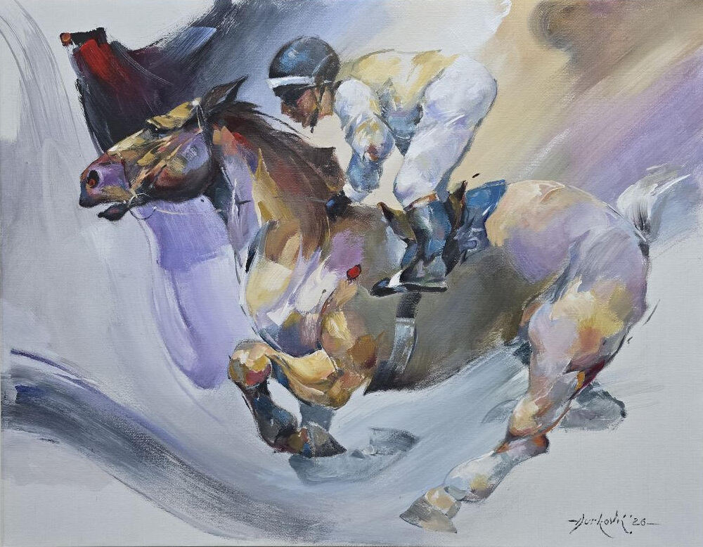 Umetnička slika Jahač slikar Braca Đurković- tehnika akril ulje na platnu – veličina slike bez rama 70×90 cm – sa ramom 86×106 cm – cena umetničke slike 259600 dinara