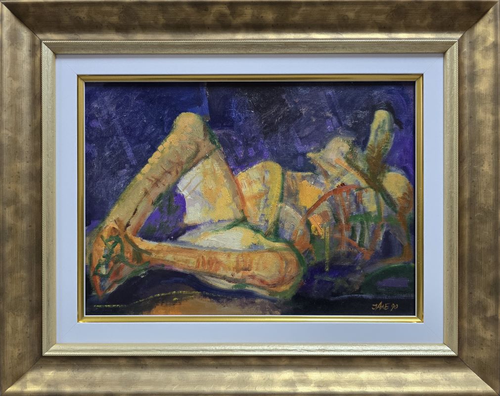 Umetnička slika Ležeća muška figura slikar Ljubodrag Janković Jale – tehnika ulje na platnu na kartonu – format slike sa ramom 38×48 cm – bez rama 25×35 cm – Cena umetničke slike 64900 dinara – godina izrade 1990.