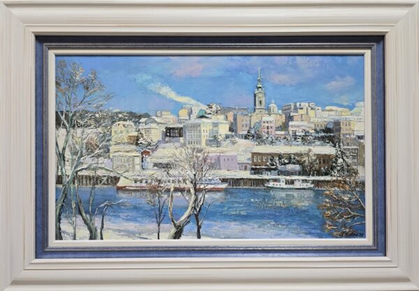 Umetnička slika Saborna crkva zimi slikar Olja Nikonova- tehnika ulje na platnu – veličina slike bez rama 33×55 cm – sa ramom 51×72 cm – cena umetničke slike 44840 dinara