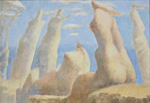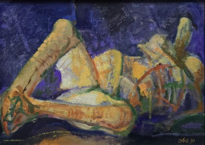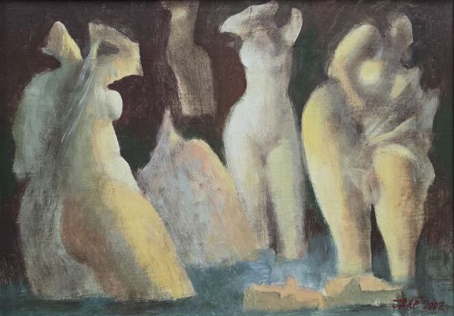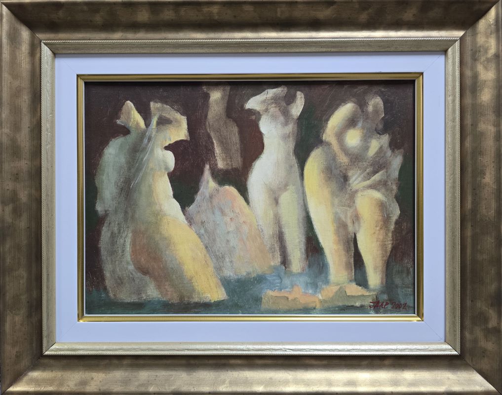 Umetnička slika Skrivene 2 slikar Ljubodrag Janković Jale – tehnika kombinovana tehnika na kartonu – format slike sa ramom 38×48 cm – bez rama 25×35 cm – Cena umetničke slike 64900 dinara – godina izrade 2002.