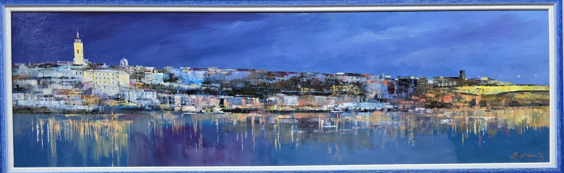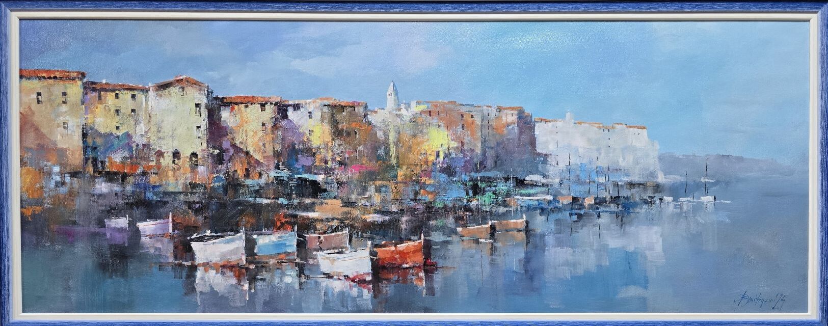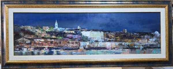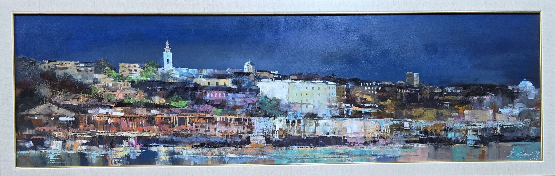 Umetnička slika slikar Branko Dimitrijević Beograd na Savi I – tehnika slikanja: ulje na platnu – format slike sa ramom 56×141 cm – bez rama 35×120 cm – Cena umetničke slike: 70.800 dinara – luksuzno uramljena i sa sertifikatom autentičnosti
