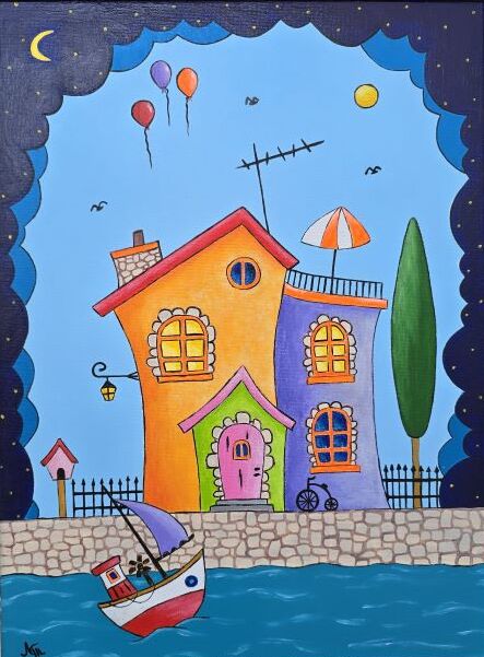 Umetnička slika slikarka Tijana Lazić Suncobran – tehnika slikanja: akril na platnu – format slike sa ramom 49×39 cm – bez rama 40×30 cm – Cena umetničke slike: 9.440 dinara
