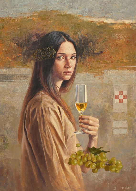 Umetnička slika Sunce u čaši slikar Vasa Dolovački – tehnika ulje na platnu – format slike bez rama 70×50 cm – Cena umetničke slike 277300 dinara – godina izrade 2024.