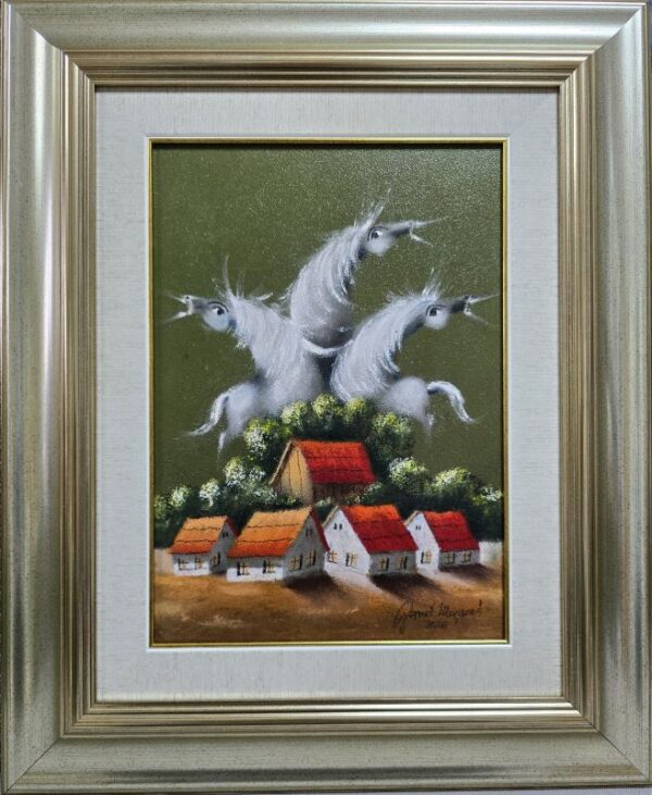 Umetnička slika Tri bela konja III slikar Janoš Mesaroš- tehnika kombinovana tehnika lak pastel – veličina slike bez rama 35×25 cm – sa ramom 56×46 cm – cena umetničke slike 35400 dinara