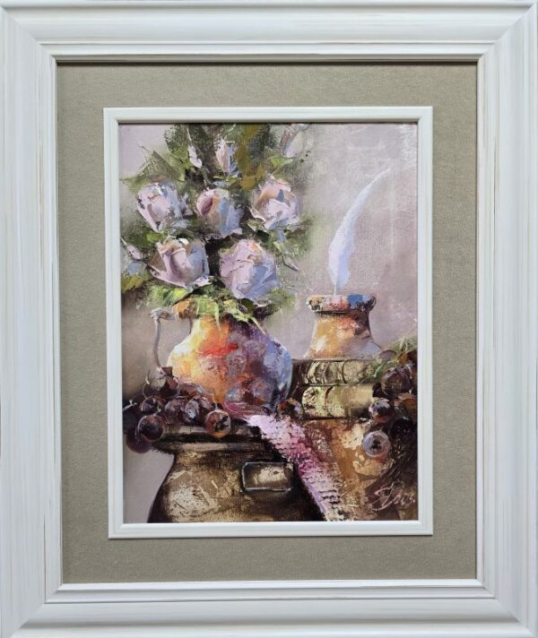Umetnička slika Vaza sa cvećem – slikar Dejan Slepčević, tehnika slikanja ulje na platnu – luksuzno uramljena – format slike sa ramom 63×53 cm, bez rama 40×30 cm – cena umetničke slike 33.040 dinara