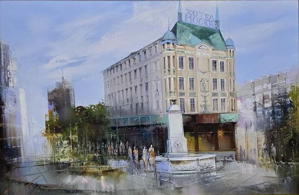 Umetnička slika Hotel Moskva slikar Dejan Slepčević - tehnika ulje na platnu - format slike sa ramom 59x79 cm - bez rama 60x40 cm - Cena umetničke slike 53100 dinara - izgled slike bez rama